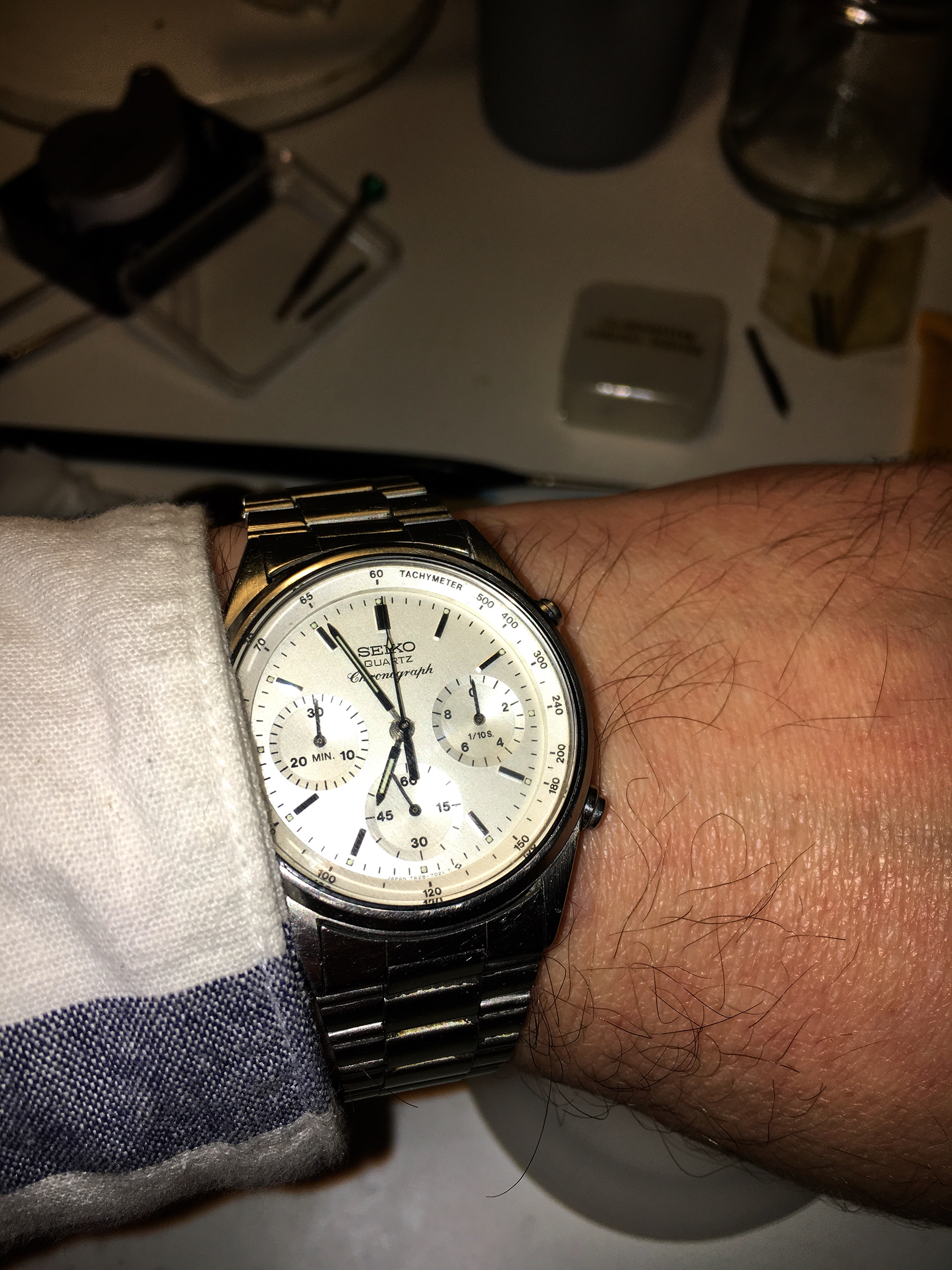 Here I endeavor to restore the dial of my esteemed Seiko 7A28 timepiece. Taking a bold leap, I resolved to replace the dial on a cherished timepiece that has been in my possession since 1990. A brief exploration revealed that my watch stands as a historic artifact, representing the inaugural Quartz Chronograph—a model that played a pivotal role in the 'Great Quartz Crisis' during the early 1980s. This movement was the very first analogue quartz chronograph movement to be produced in the world and the first quartz chronograph to be used by the Ministry of Defence. This watch, dated December 1982, preceded the official release in 1983.